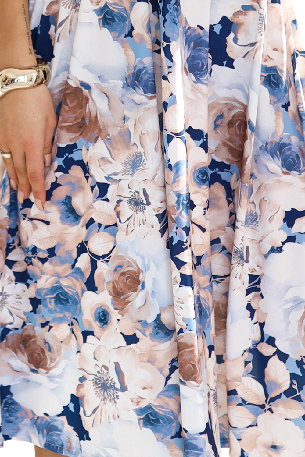 425-13 MATILDE Feminines Kleid mit Ausschnitt und kurzen Ärmeln - beige und blaue Blumen