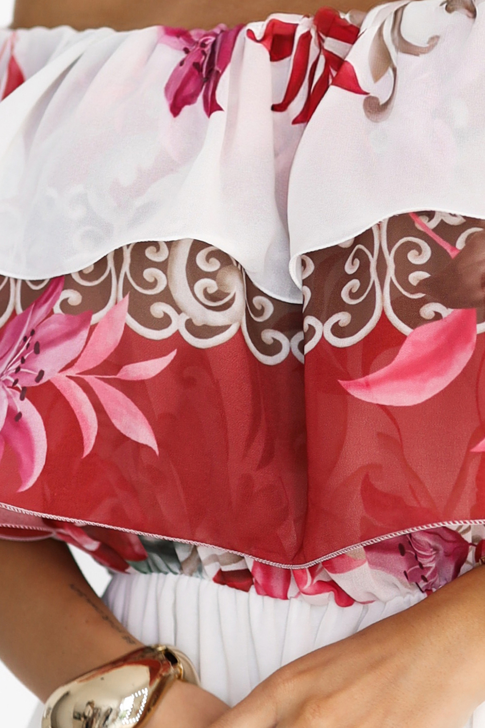 Blumen-Maxi-Kleid Carmen-Stil mit Volant – Numoco Basic