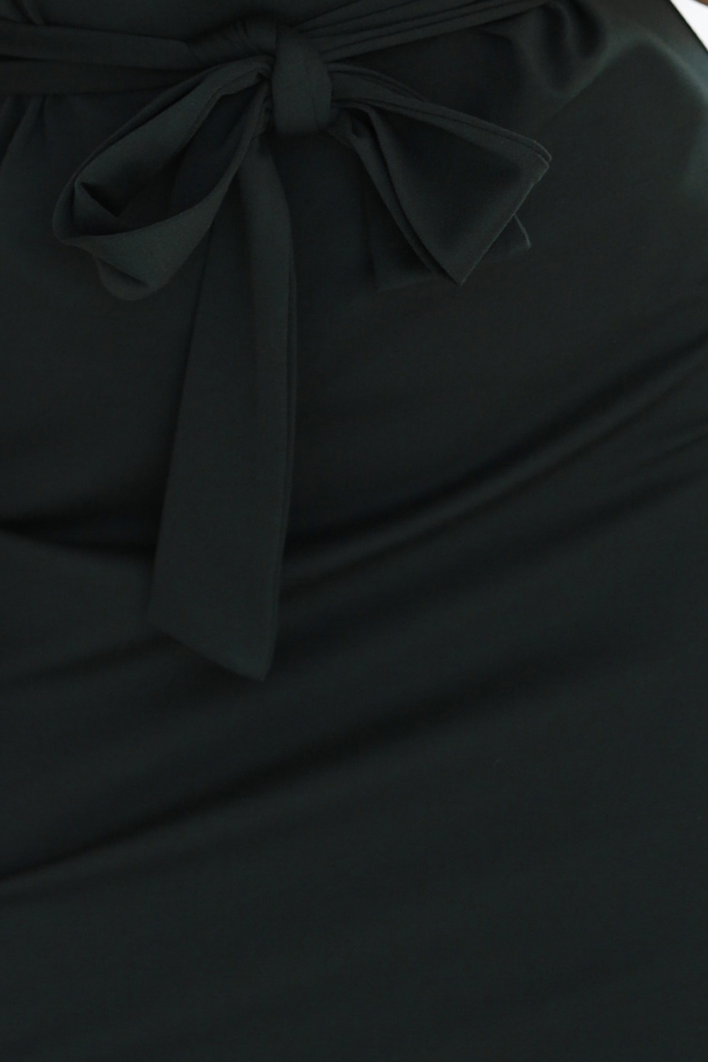 Stilvolles, figurbetontes Kleid im trendigen dunklen Khaki ist ein Must-have in der Damengarderobe. Das Modell hat kurze Ärmel, subtilen Boot-Ausschnitt und Taillengürtel zum Binden, der die Silhouette wunderschön betont.