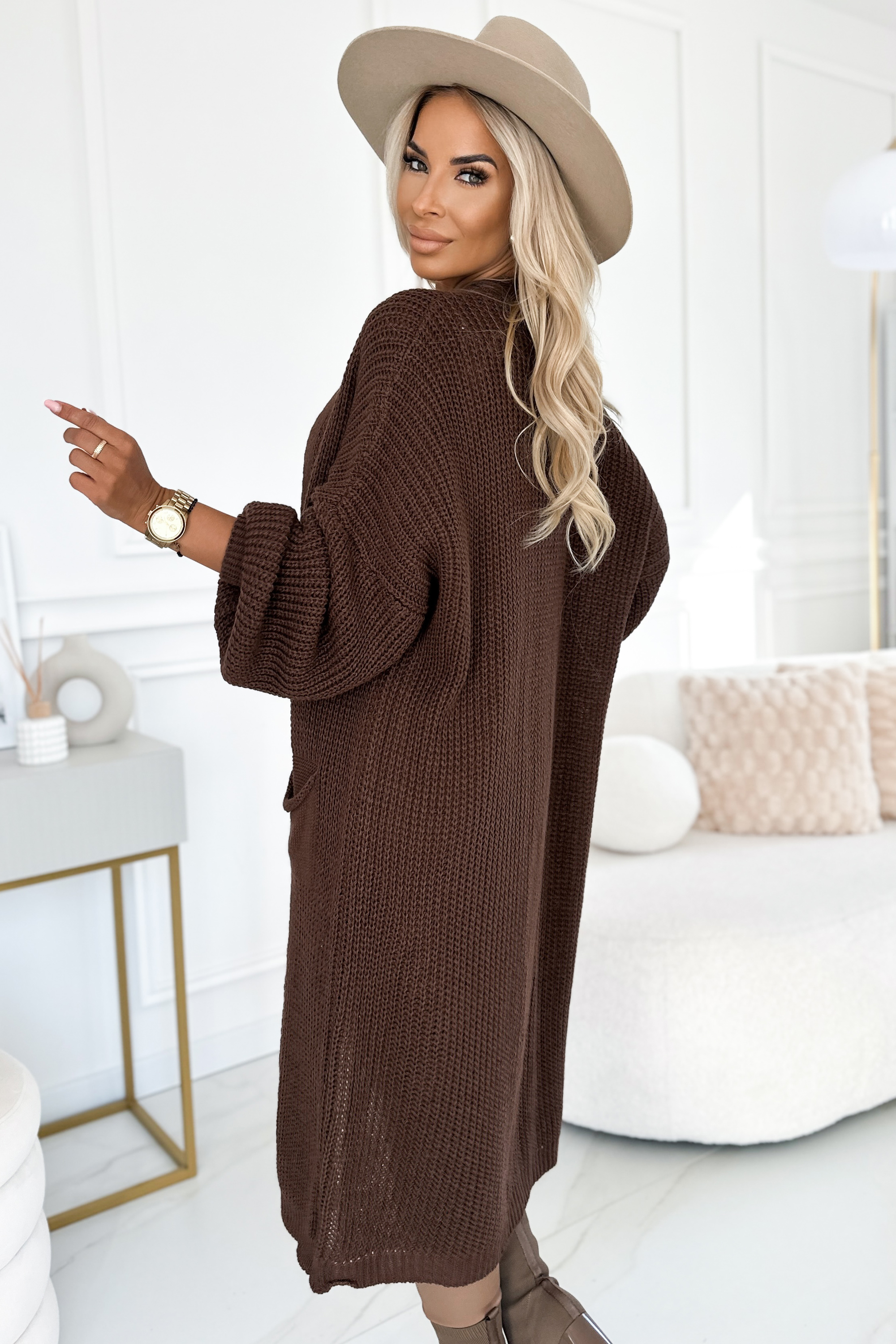 627-2 Strickjacke - langer Pulloverumhang mit Taschen - Schokoladenfarbe