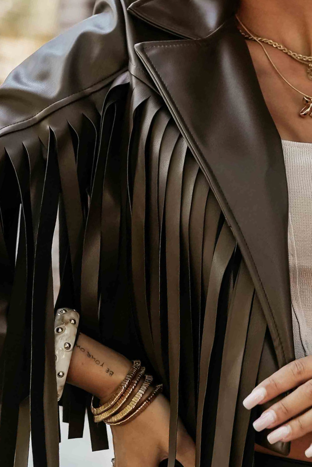 624-4 Kurze Jacke mit Fransen aus weichem Öko-Leder - Schokolade