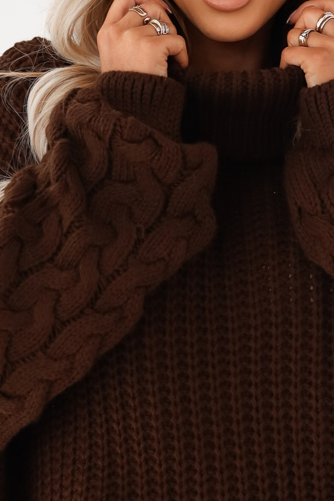 Dieser Schokoladenpullover ist äußerst vielseitig. Für einen Kontrast kombinieren Sie ihn mit einem anliegenden Unterteil – ein Leder-Minirock (wie auf dem Foto) oder gewachste Röhrenhosen funktionieren großartig. In der Casual-Version kombinieren Sie ihn mit Ihrer Lieblingsjeans und Stiefeletten. Es ist die perfekte Basis für Herbst-Winter-Stylings.