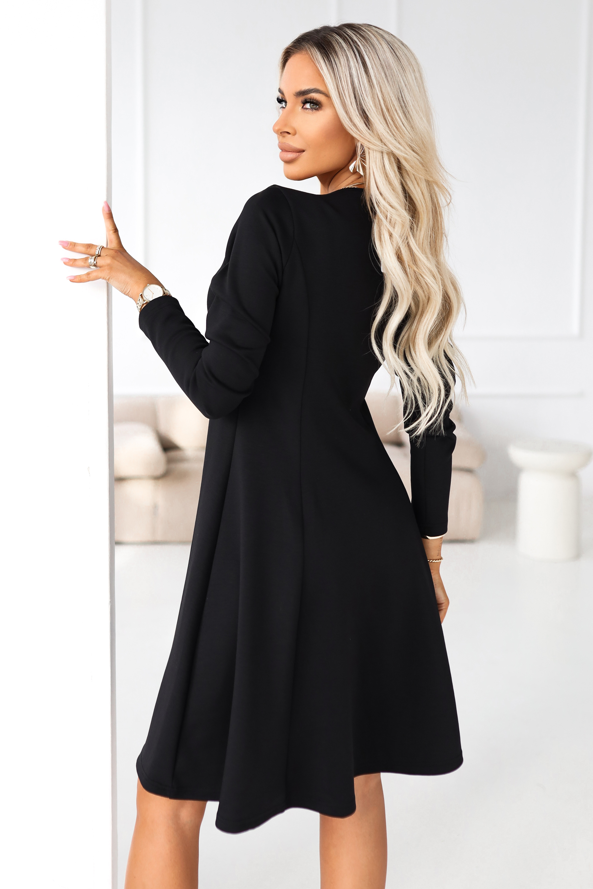 574-3 IVANA Bequemes Trapezkleid mit Ausschnitt und langen Ärmeln - schwarz