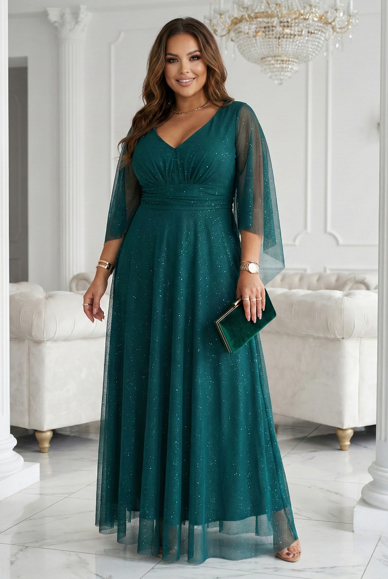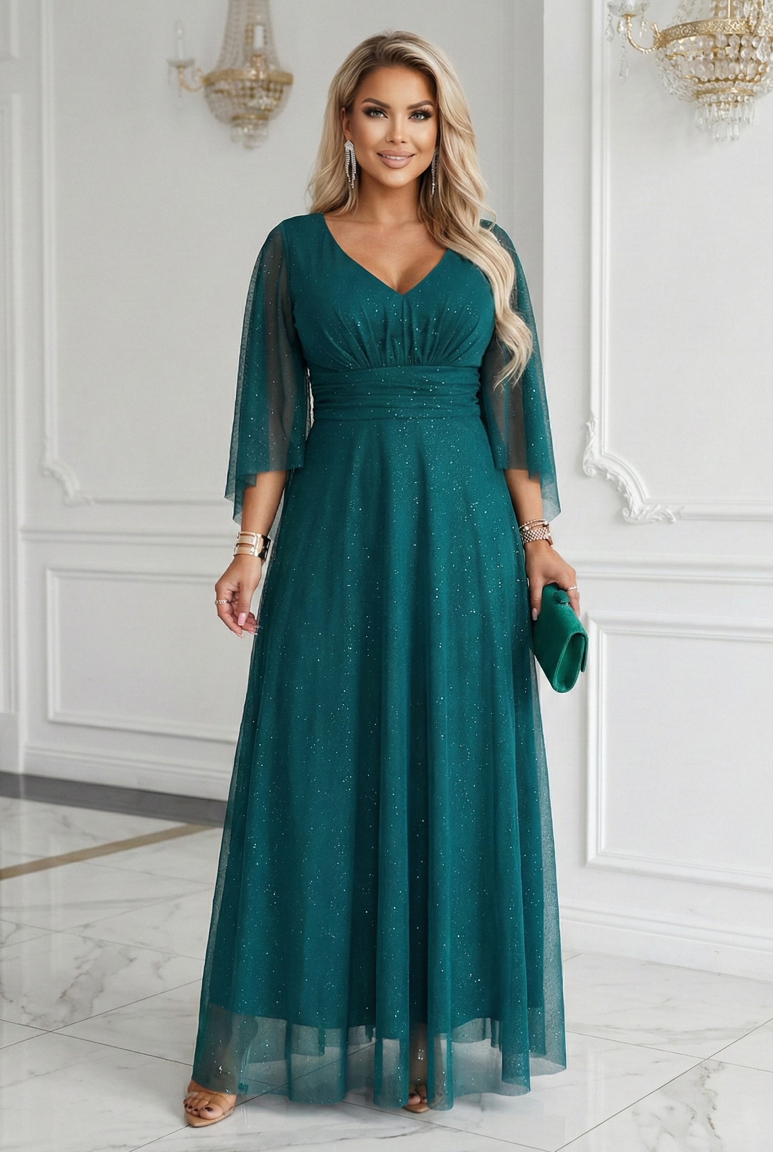655-2 Ein langes, schimmerndes Kleid mit tiefem Ausschnitt und transparenten Ärmeln - smaragdgrün