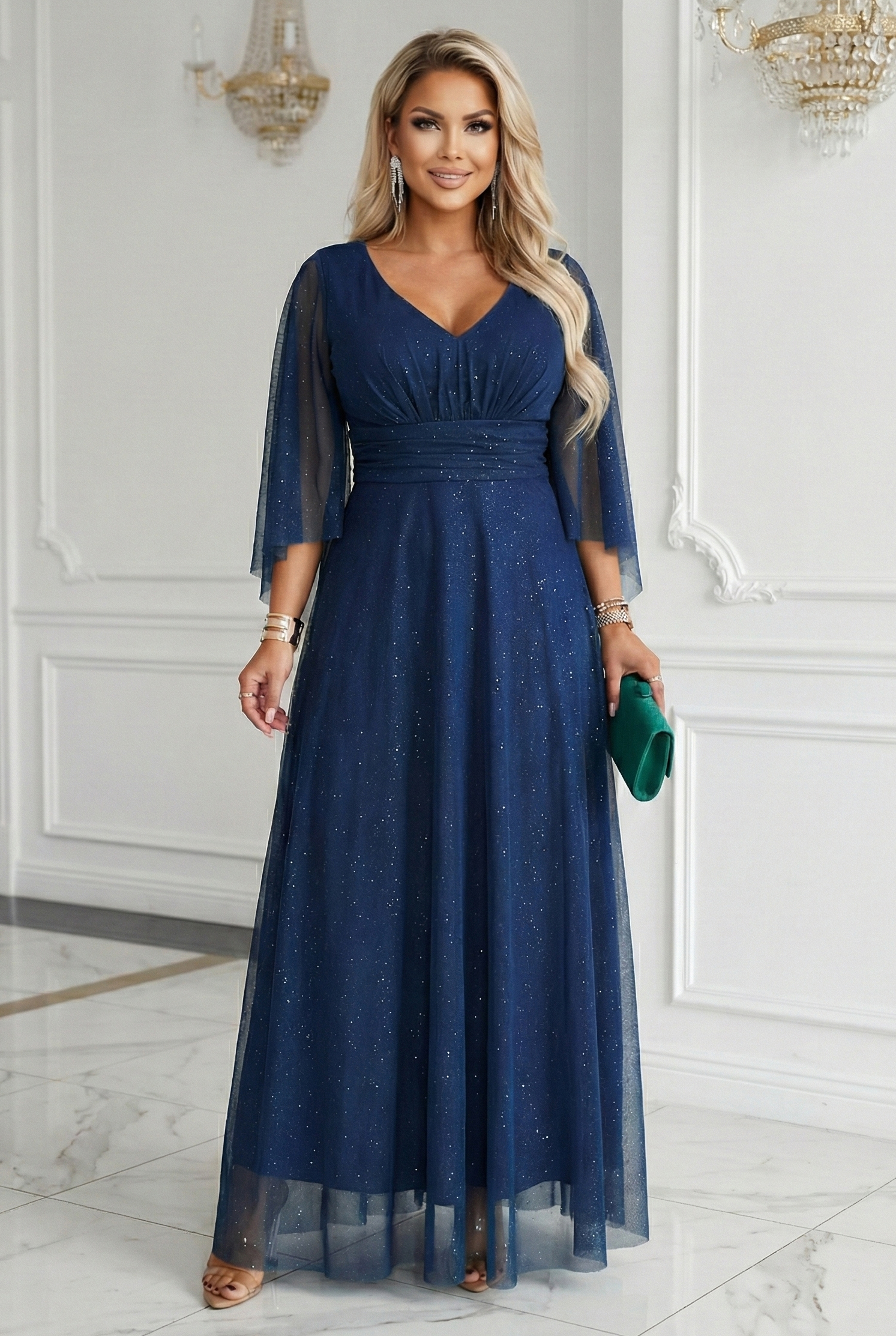 Marineblaues Maxi-Kleid mit Glitzer-Finish von Numoco Basic ist ein eleganter Vorschlag für Frauen, die nach einer Kreation für Hochzeiten, Bälle oder Abschlussbälle suchen. Das Modell wurde so entworfen, dass es die Silhouette wunderschön betont - sowohl in Standardgrößen als auch Plus Size - weshalb es hervorragend bei Frauen funktioniert, die schlanker aussehen möchten und sich gleichzeitig völlig frei bewegen wollen.