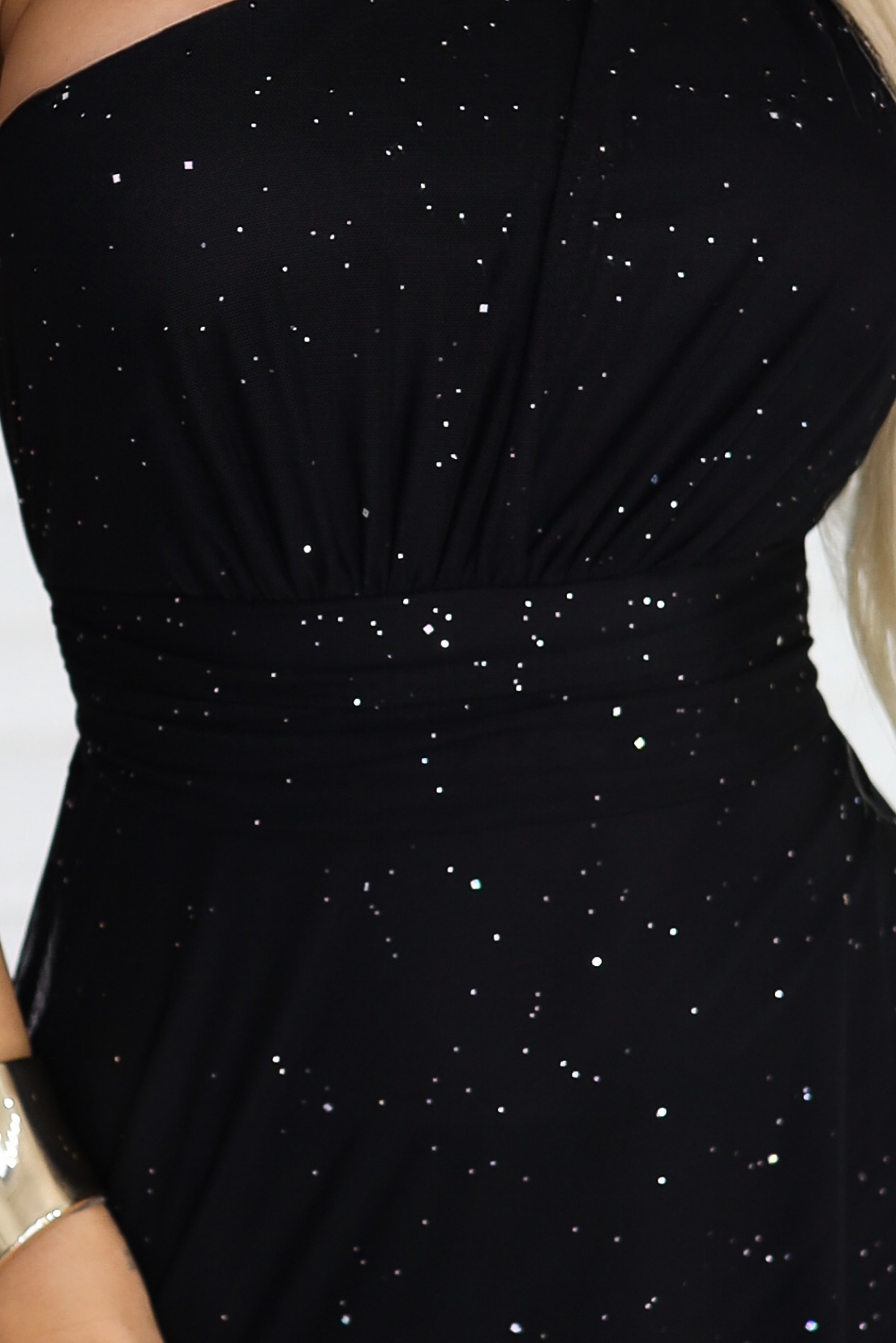Schwarzes Maxikleid mit Glitzerschimmer auf einer Schulter - Numoco Basic